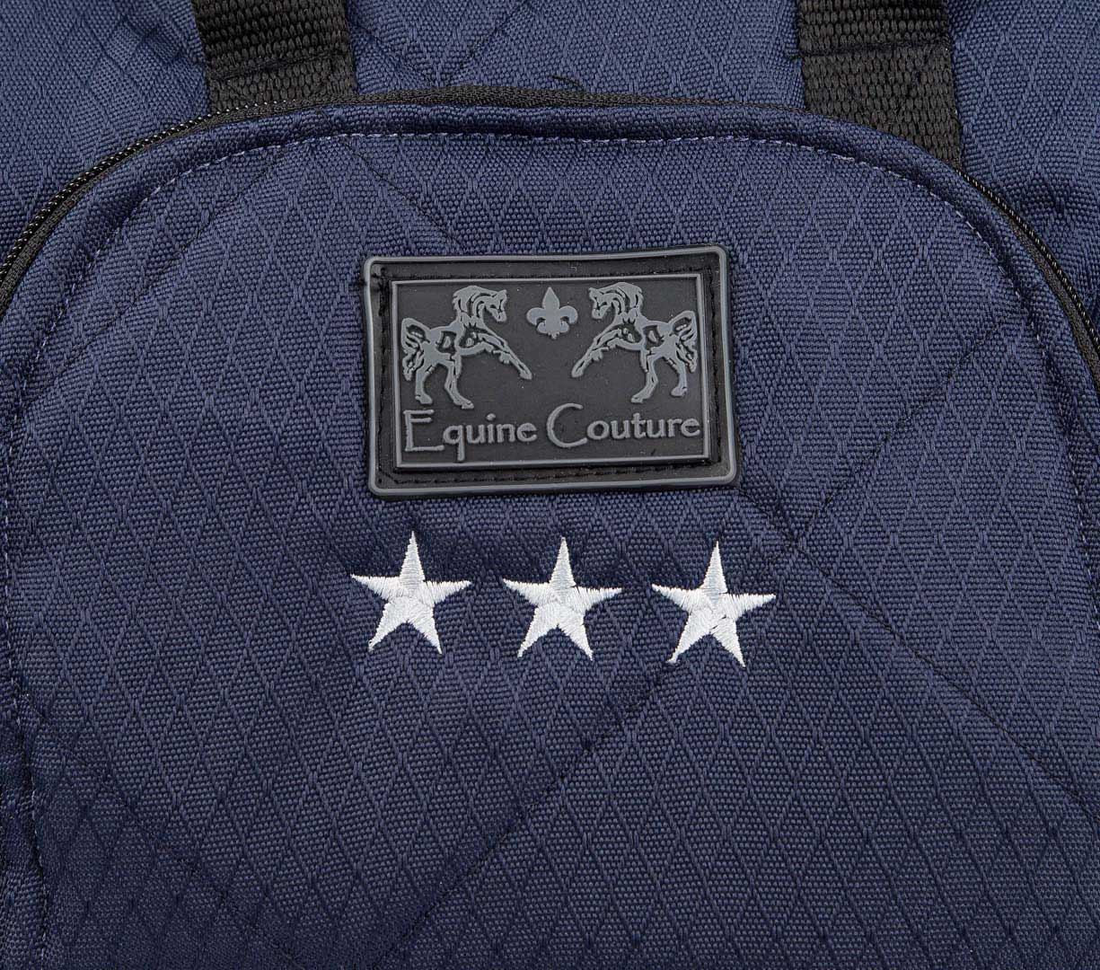 Carry fewer bags with you to the barn and shows with Equine Couture Super Star Helmet and Boot Bag. This polyester bag combines the boot and helmet bags into one unit. The full zippered bag stores your boots while the large full zipper pocket in front stores your helmet and contrast star tape piping. There are also grab straps for easy transporting. While this bag carries more, it's still lightweight yet durable. Keep your equipment safe from the elements with this smart, subtle bag designed to suit all tastes and styles. This bag has a grab strap and two over the shoulder straps.