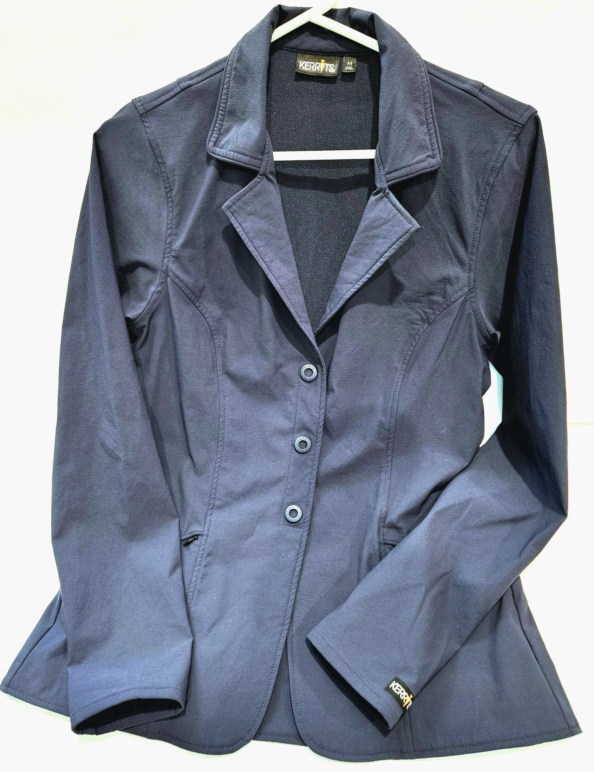 All-weather, lightweight, navy blue Kerrits show coat. Features zipper with button snaps.