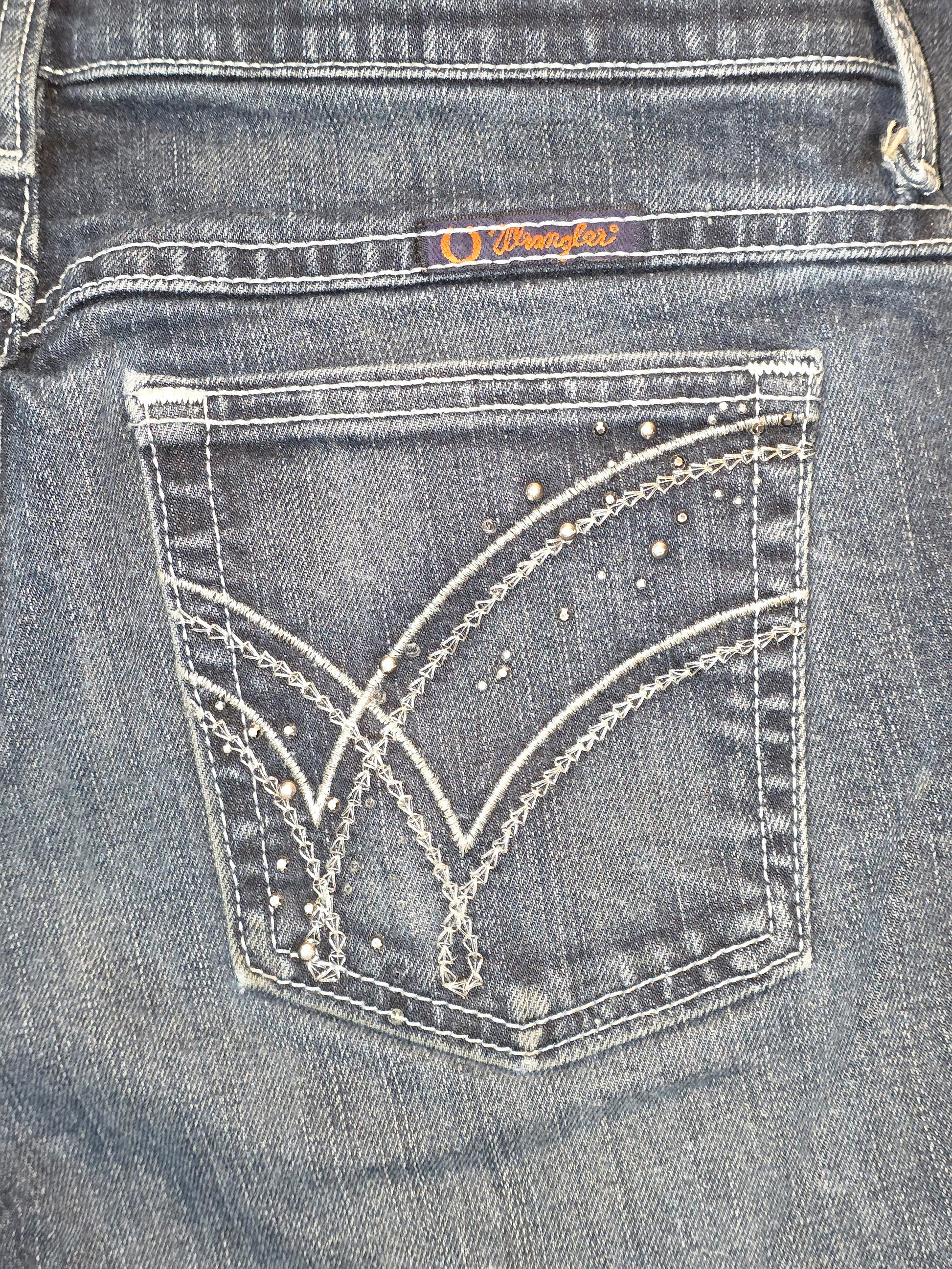 Women's wrangler Q-baby bootcut riding jeans with no-gap waist band.